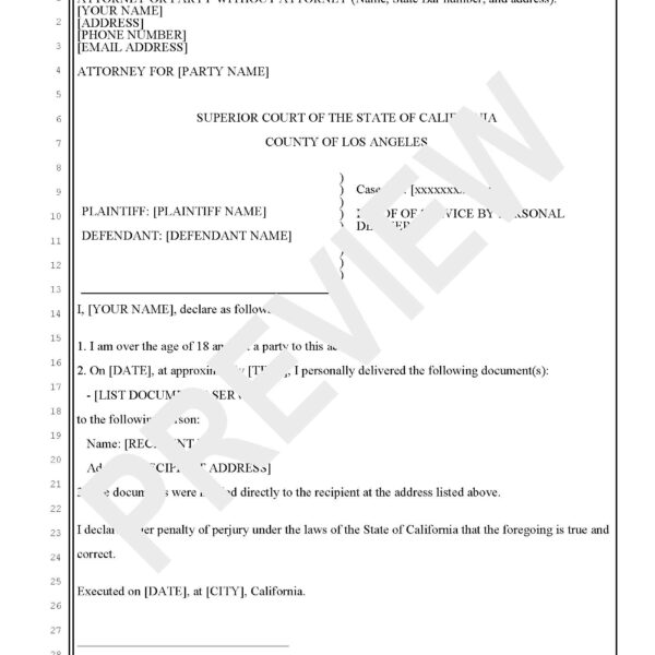 Proof of Service by Personal Delivery (California – Pleading Format)