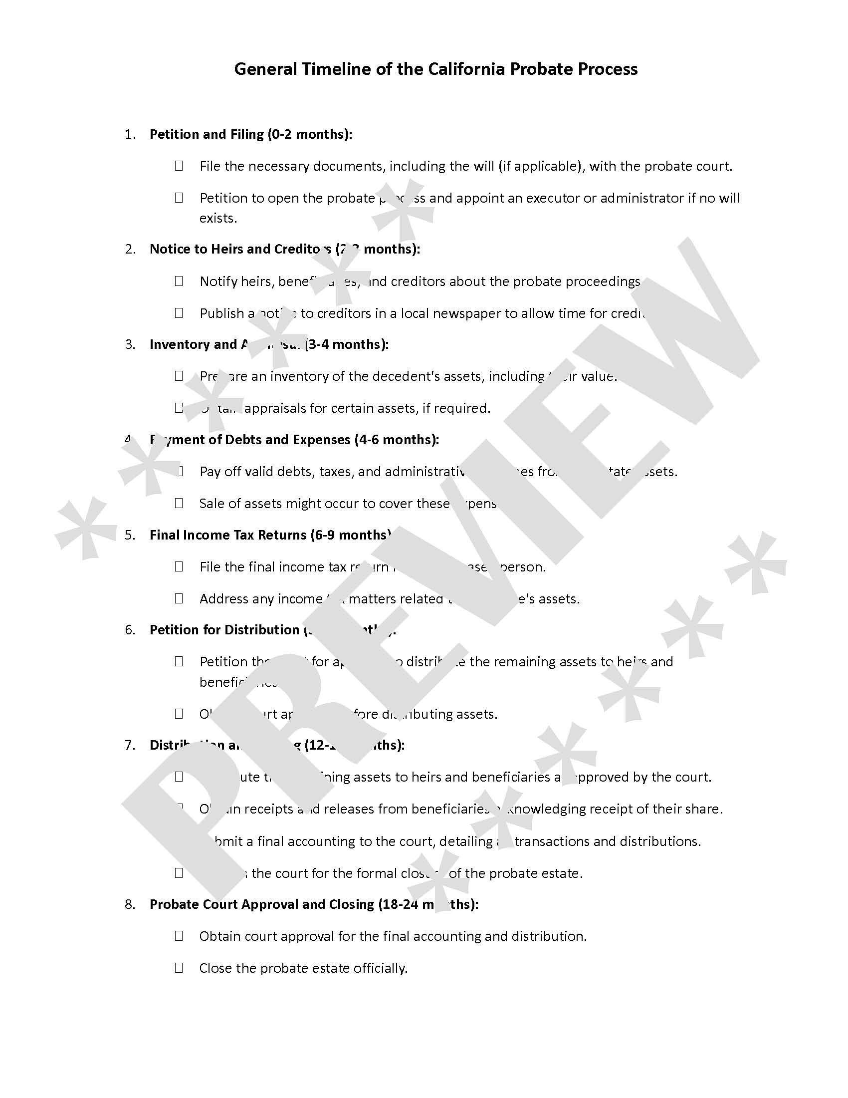 Navigating the probate process in California can be complex and time-consuming. This General Probate Timeline provides a structured overview of the key steps and estimated timeframes involved in administering a decedent’s estate through the court system. Whether you’re an attorney managing probate cases or a client seeking clarity, this guide helps set expectations and track progress.