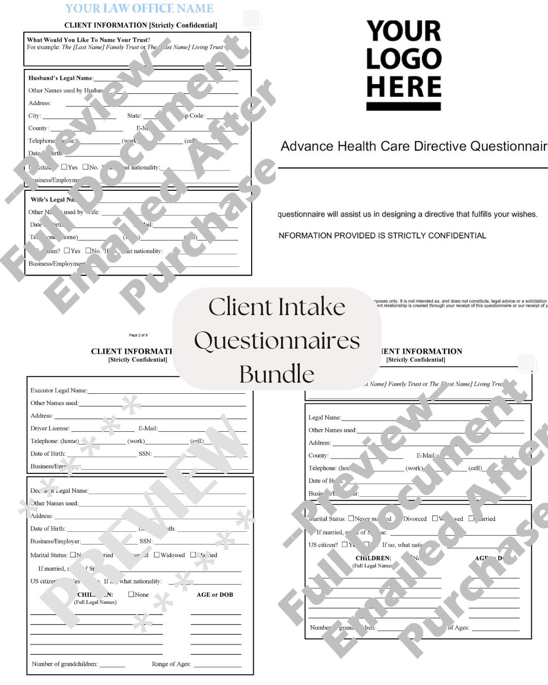 This Client Intake Bundle includes four professionally designed questionnaires used by estate planning and probate attorneys to onboard new clients efficiently and thoroughly. Whether you’re creating a new estate plan, preparing an Advance Health Care Directive, or assisting a trustee or executor post-death, these forms help ensure you capture the key information needed to move the matter forward.