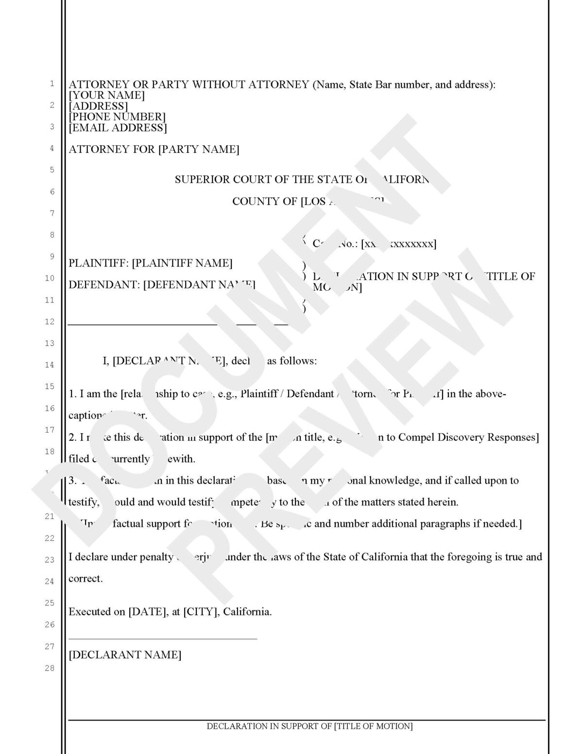 Court-ready declaration template to support motions or oppositions. Clean, professional, and formatted on pleading-style layout.