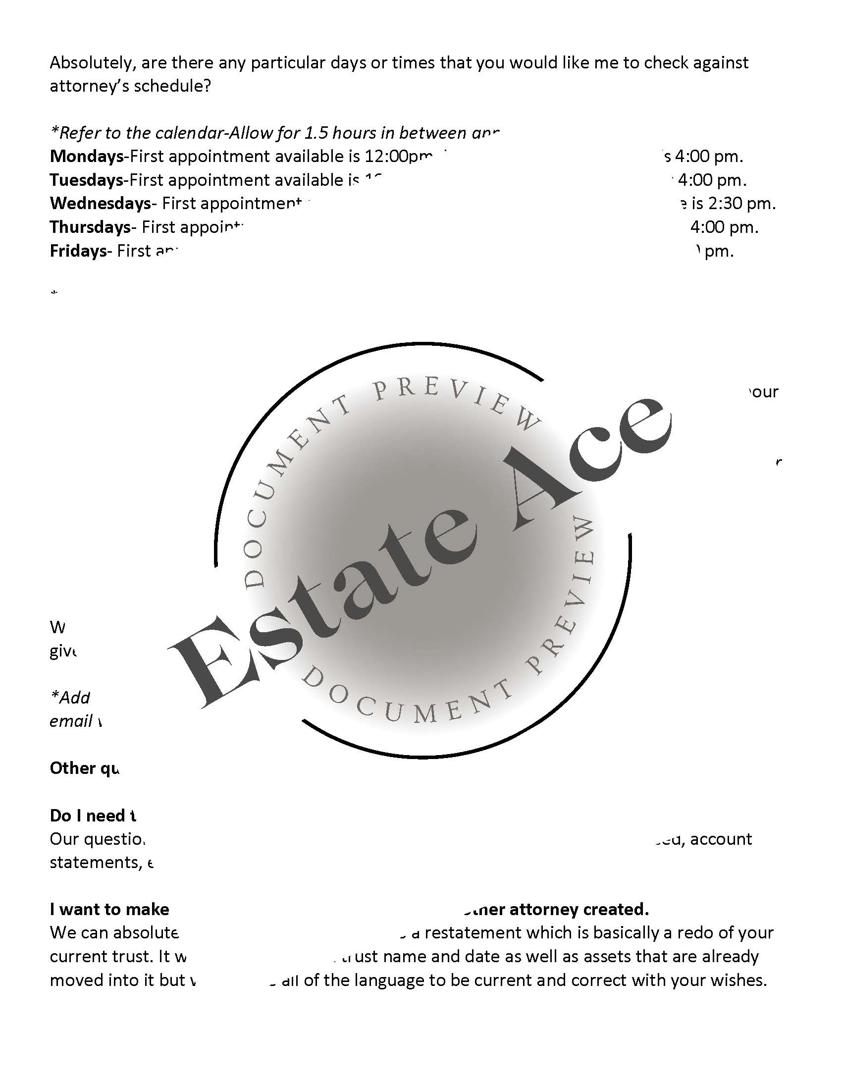 ✔ Handling Common Client Questions – Pre-written responses to frequently asked questions, including trust restatements, amendments, and required documentation.