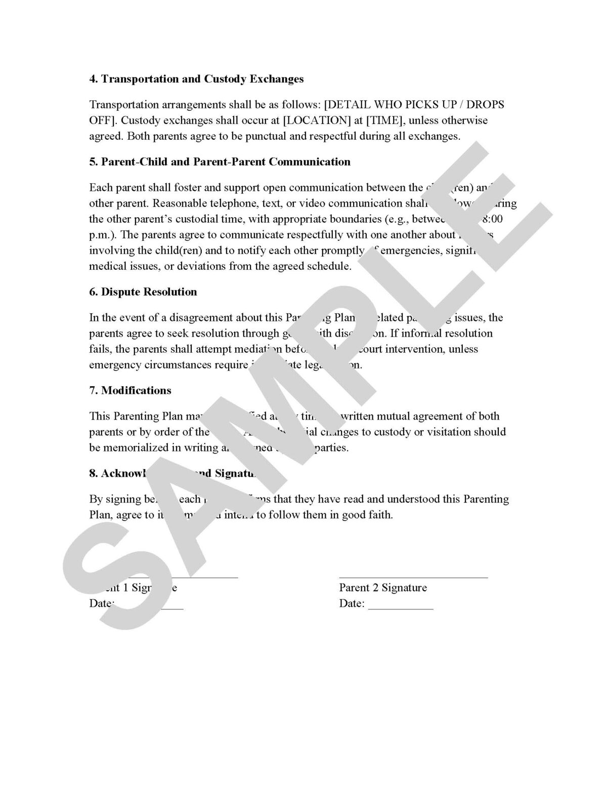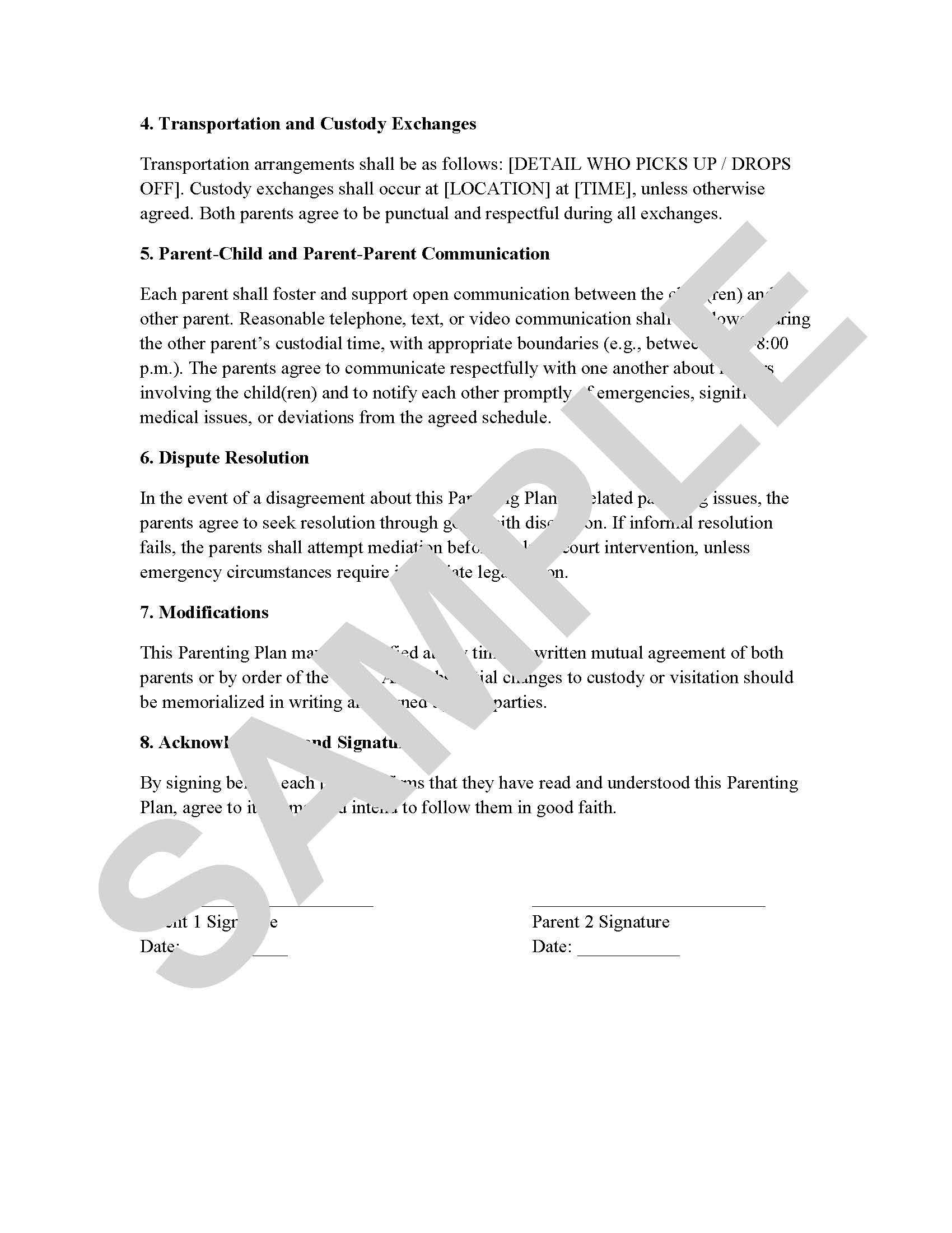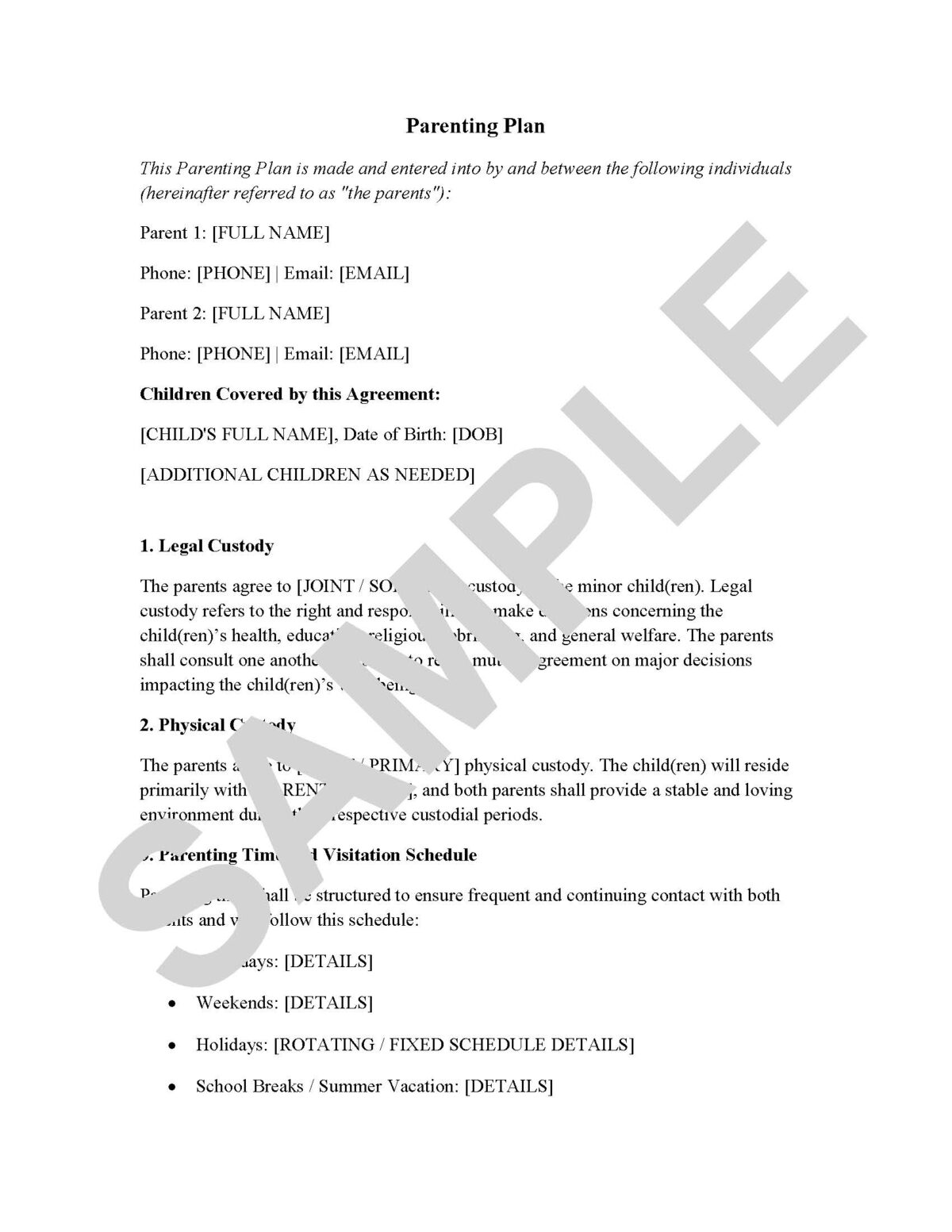 A structured, customizable parenting plan template to clarify legal and physical custody, visitation, communication, and dispute resolution.