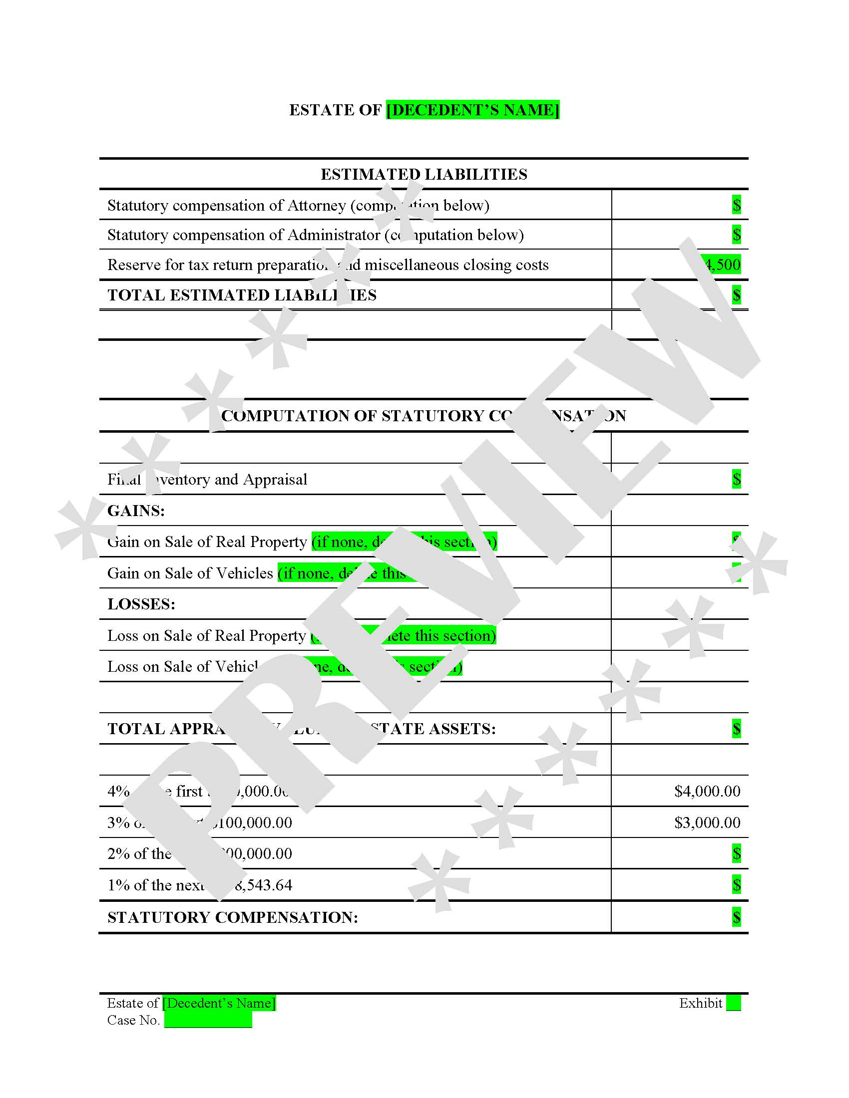 Estimated Liabilities Table – Summarizes statutory attorney and administrator compensation, tax preparation reserves, and other closing costs.